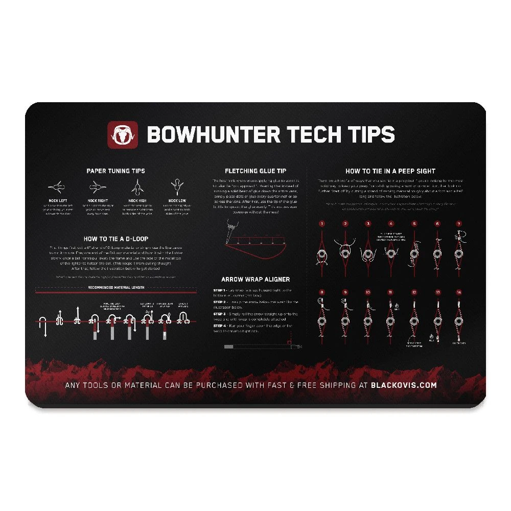 How do you tie a D Loop? What’s the best way to paper tune? With those and other bowhunting basics in mind, BlackOvis and the Custom Arrow ID team came up with the Ultra 20 Premium Bowhunter Tech Tip Mat. This 15×20 soft and durable premium neoprene mat is right at home on your work bench, bow tuning bench or anywhere you need to get some intricate work done and need a soft pad to organize or layout small or micro pieces of gear. The soft thermoplastic fiber surface ensures your archery equipment doesn’t get scratched while the vulcanized rubber will protect your work surface and prevent the mat from sliding. Ideal for applying wraps to arrows, laying out fletching supplies, broadheads or even disassembling and cleaning a handgun, this mat is a must for any bowhunter. Tech tips/How to info include: Paper Tuning, How To Tie in a Peep Sight, Fletching Glue, Arrow Wrap Aligner and How to Tie a D-Loop. Hone your skills and improve the look of your workbench with a tech tip mat that makes sense for any bowhunter.