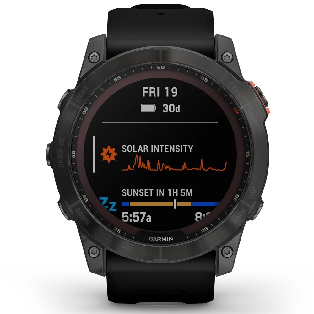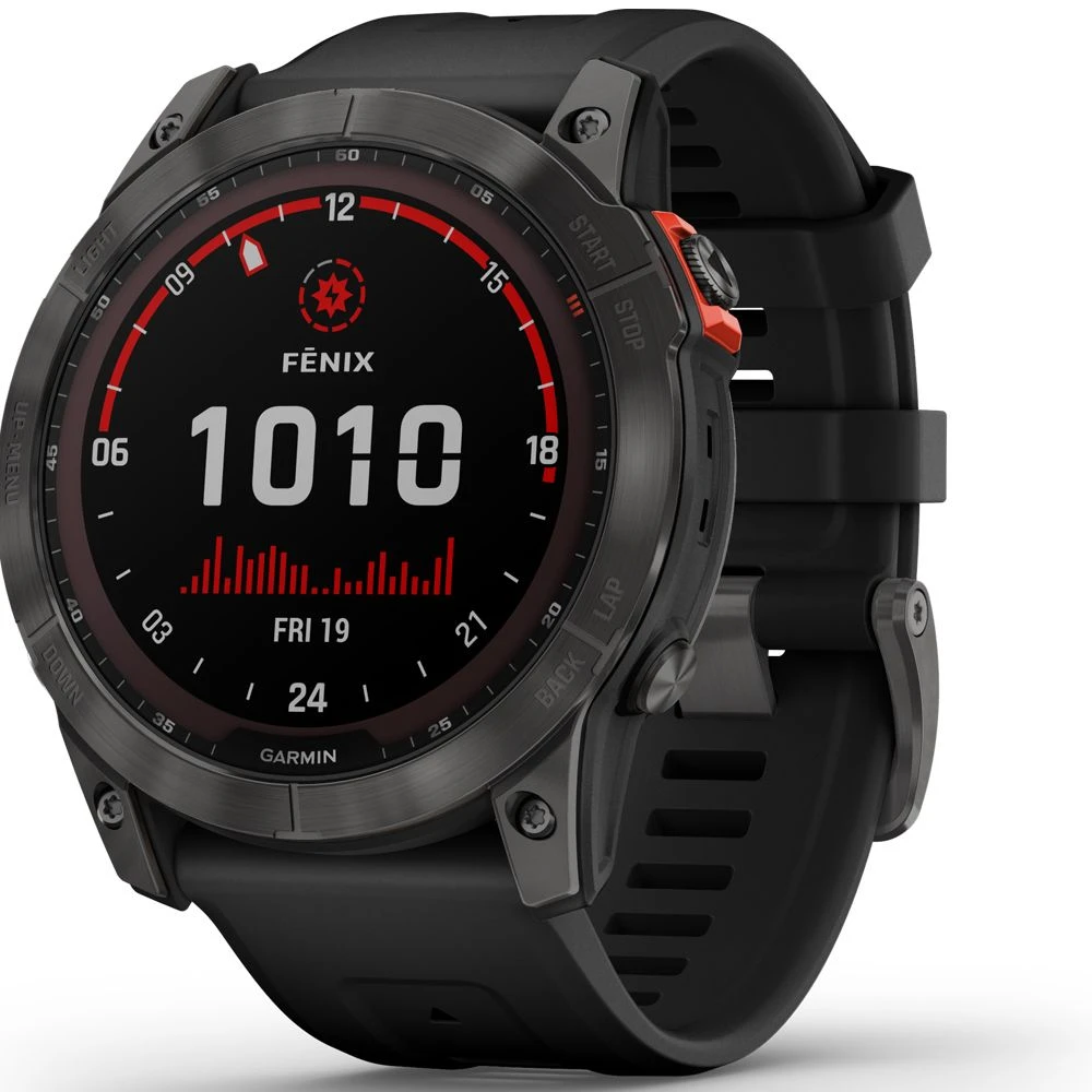 Meet any athletic or outdoor challenge with the rugged fēnix 7X Solar multisport GPS watch. Its Power Glass™ solar charging lens uses the sun’s energy to extend battery life — powering advanced training features, sports apps, health and wellness monitoring sensors and more.