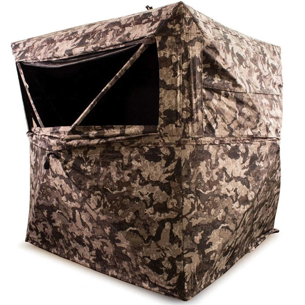 The HME Executioner Ground Blind is 62 inches wide and 66 inches tall making it a perfect size for two hunters.The 2-Person 150 D Shell is water resistant and has two full width window for easy visuals. The blackout interior helps any inside movement from being noticed. The brushed holders allow you to attach limbs and brush for a more natural look. The silent slider window allow you to adjust without making any noise. Special pockets above the window will allow you to place an Ozone generator( not included). Carry bag, tie downs and ground stakes are included.
