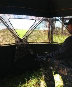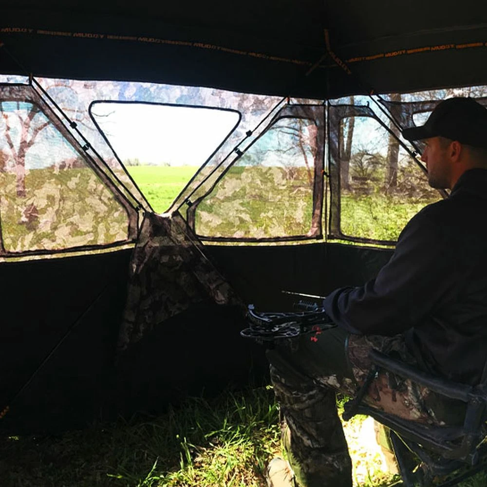 The ultimate ground blind has arrived! Introducing the Muddy Infinity 3-Man Ground Blind w/ innovative SHADOW MESH drop down window curtains which allows you to see out but wary game can’t see in! Users have the choice as to which, if any, SHADOW MESH windows they would like to leave open as there are three independent windows per side. Also included is an ultra-dark interior coupled with ozone loft pockets to keep you undetected from weary game and up your odds of finding success. With an ample amount of room, you’ll be able to stretch out and still take the whole family out to the field with you and have more than enough space to make the shot. The Infinity 3-Man Ground Blind comes equipped with a large zippered door, ultra sized webbed base loops for larger stakes or t-posts, a small drop down “peek” window in the back for viewing or shooting, an oversized carry bag, rope, and stakes. Feature packed with a price point for the hard working hunter, the Infinity 3-Man Ground Blind from Muddy Outdoors is here to take the industry by storm!
