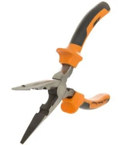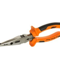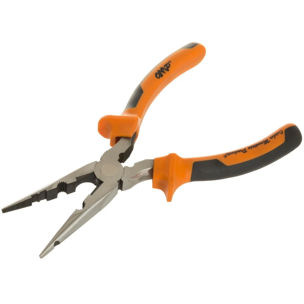 Specifically designed for use in a pro shop setting. Features six primary archery plier functions in one: needle nose plier, D-loop grooves, nock removal tool, nock set, wire cutter, and star key plier. Molded ergonomic grips reduce hand fatigue. Black and orange handles feature pad printed OMP logo.