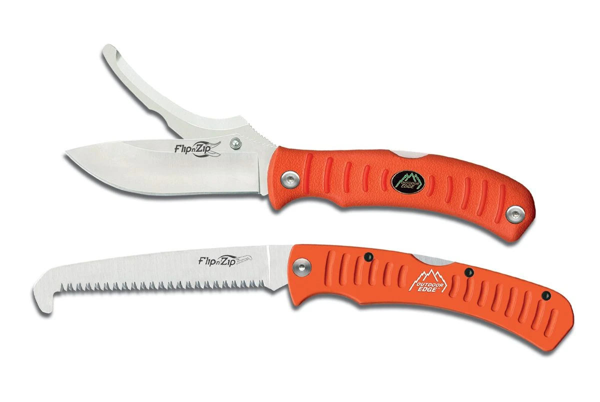 The Flip nā Zip Combo with easy to locate blaze orange handle. Both skinning and gutting blades open, close and lock independently. Ergonomic rubberized Kraton handles with Traction-Slots offer a secure non-slip grip. Stainless 8Cr13MoV blades with one hand opening studs are hand finished shaving sharp. Triple ground folding saw with rubberized aluminum handle. Makes easy work of cleaning game and clearing limbs. Complete with quality nylon belt sheath