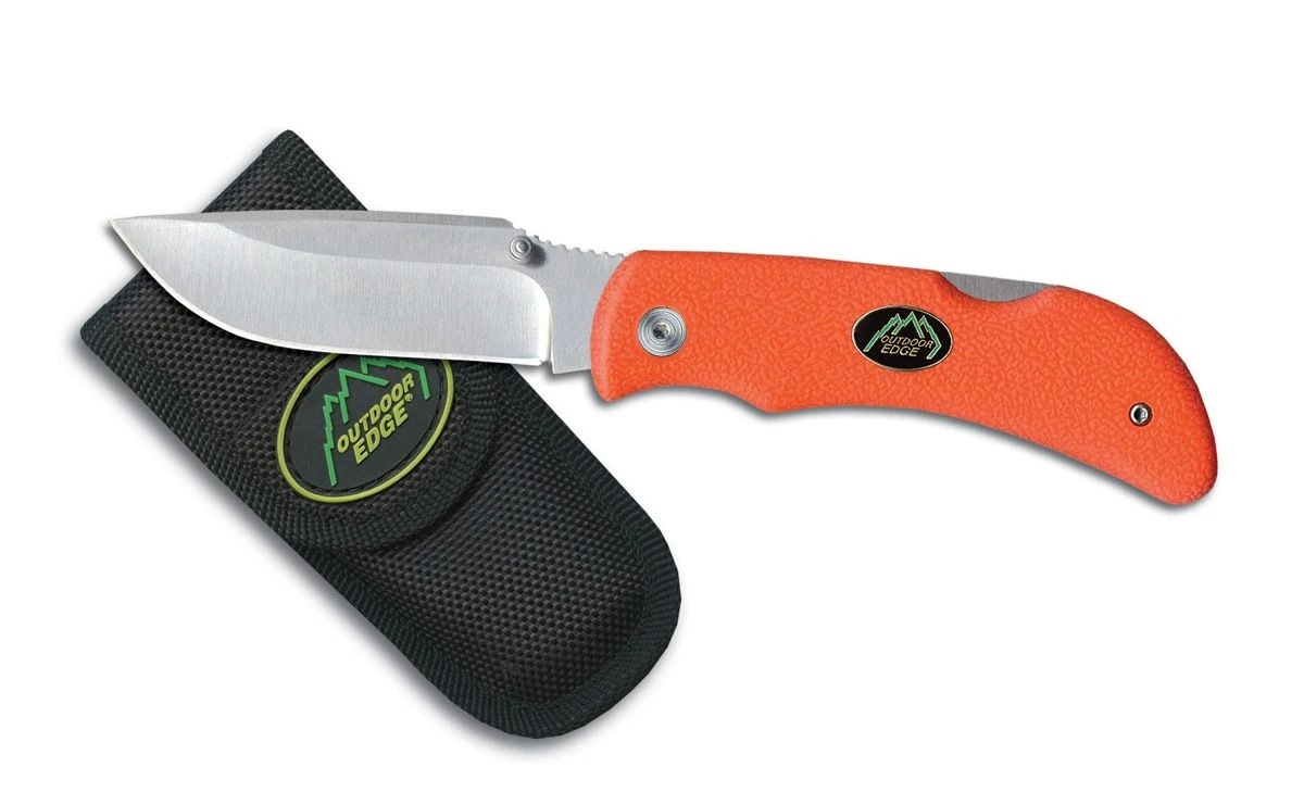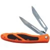 Drop-point skinner blade with easy to locate, non-slip orange Kraton® handle. AUS-8 stainless blade and double sided thumb stud.