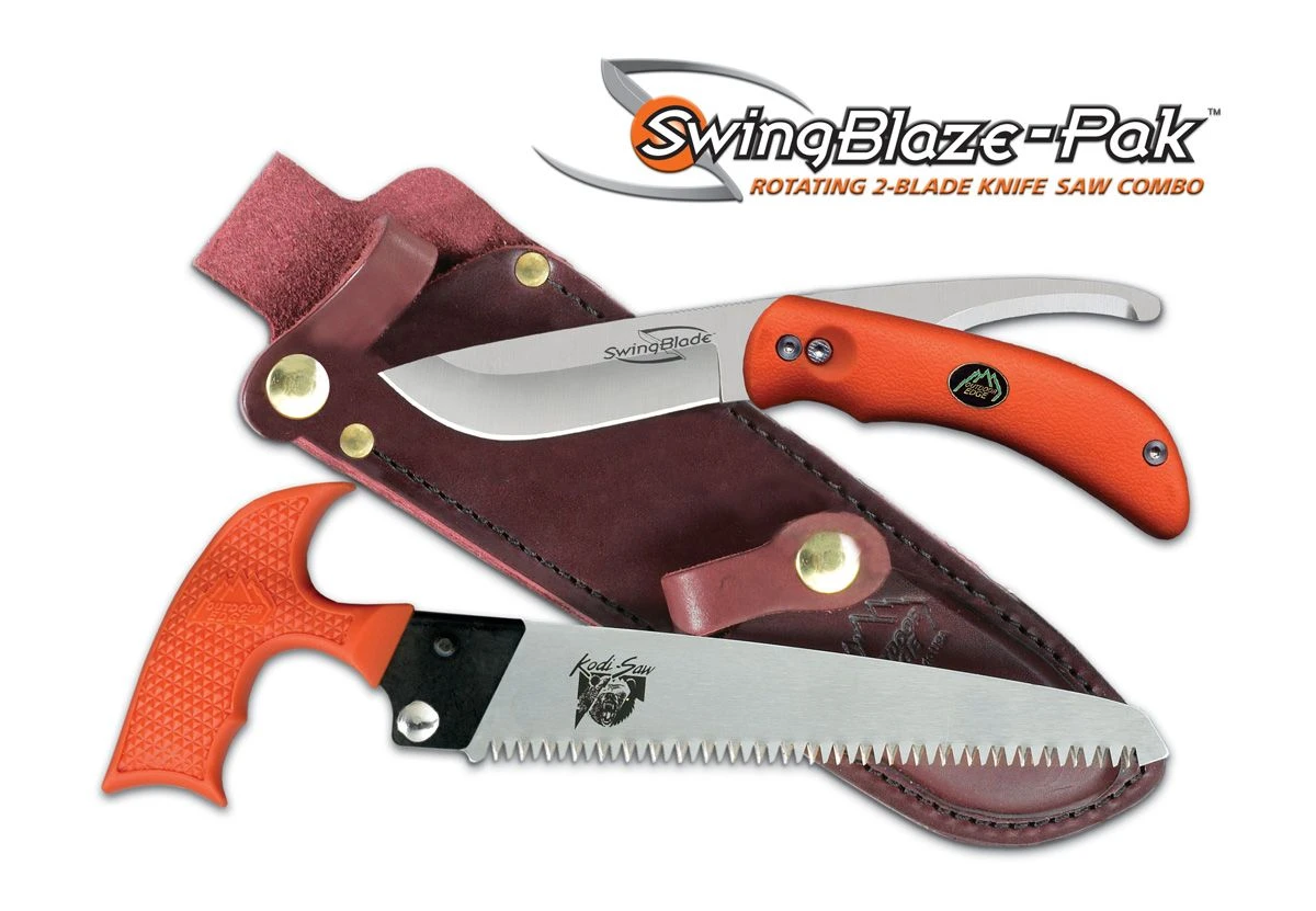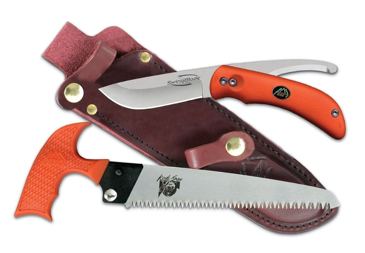 The most functional hunting knife/saw combo to hit the market in years. Combines Outdoor Edge’s popular new SwingBlaze and 6″ Kodi-Saw on a full grain leather belt sheath. This practical set is the perfect light-weight knife/saw combo for big game. Blaze orange to never lose you knife/saw again.