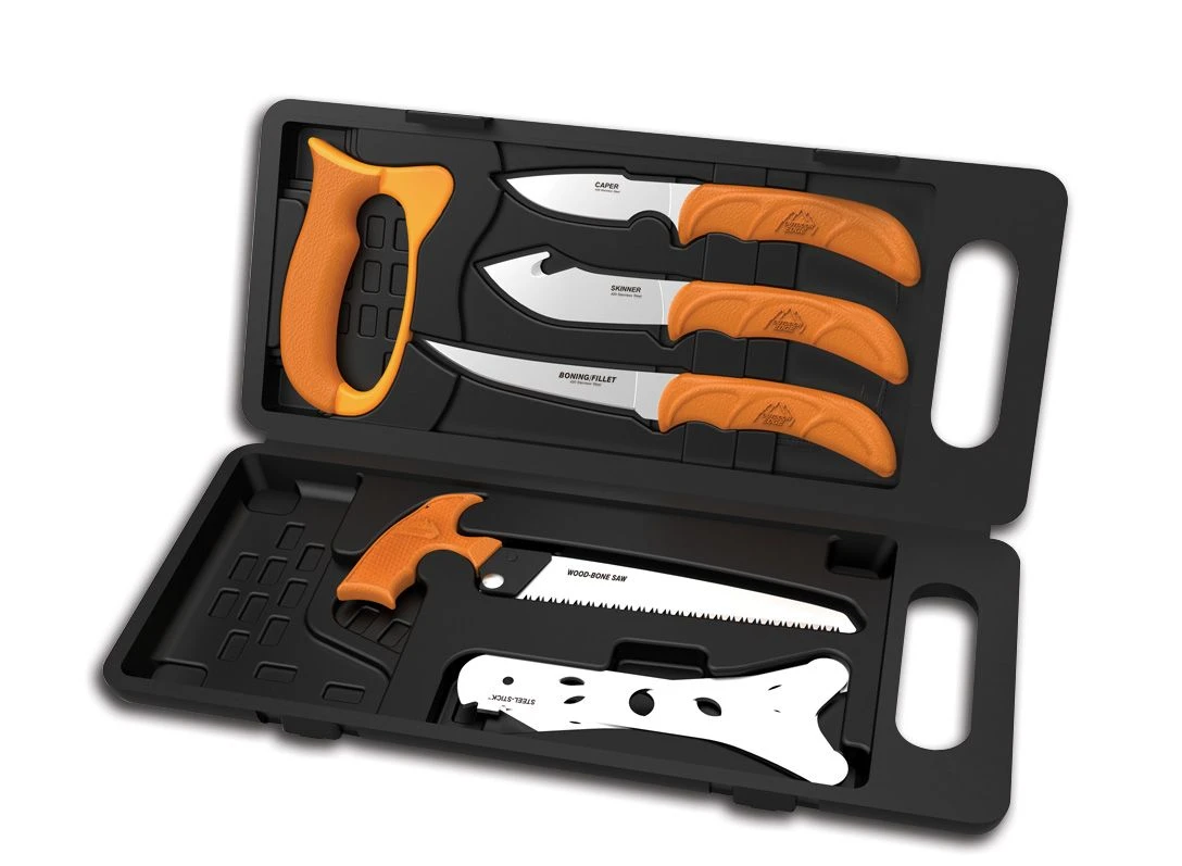 Light-weight, 8-piece field-to-freezer game processing set with all the tools to help get the job done. Comes complete with full-tang caping knife, gut-hook skinner, boning knife, carbide sharpener, wood/bone saw, ribcage spreader and game cleaning gloves all in a hard-side carry case. Non-slip rubberized blaze-orange handles never get lost and feature a horn pattern inlay for enhanced grip.