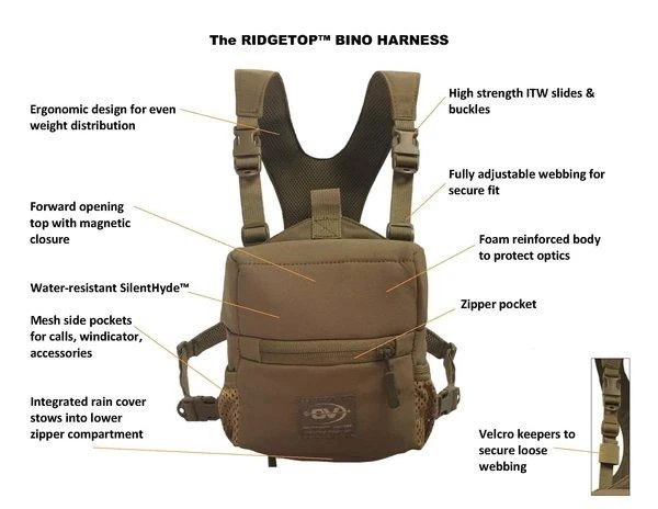 Together, with the hunting community, we designed the RIDGETOPâ„¢ Bino Harness. We took the most desired components from user input, added our own features, and created the most functional bino chest harness system ever. Designed for a tight, snug fit, the bino case harness eliminates bounce and sagging, while ergonomically configured to allow for even weight distribution across the torso.