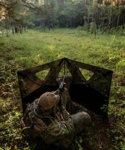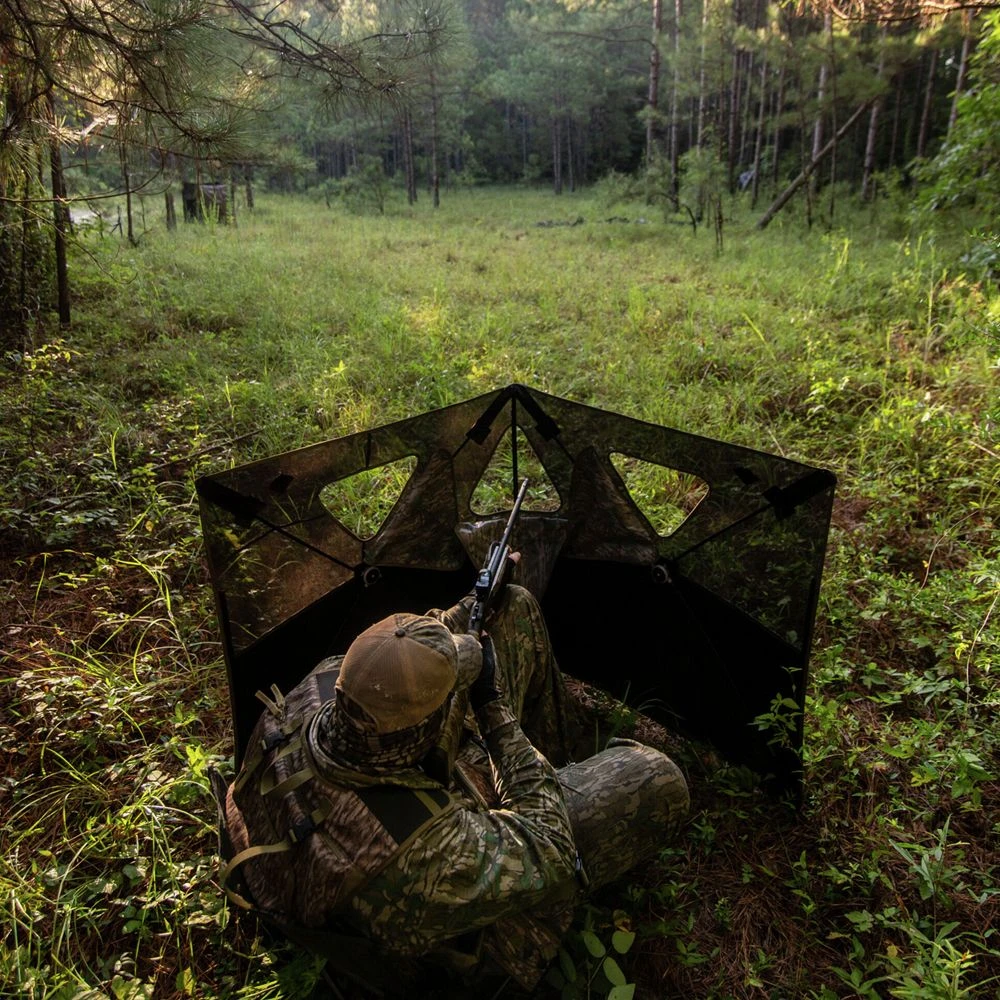 Thousands of very small holes dot the fabric. On the outside, the camo print and natural light force human and animal eyes to focus on the camo, making the holes “invisible.” On the inside the black print and darkened interior allow your eyes to focus through the holes for a clear view of the outside